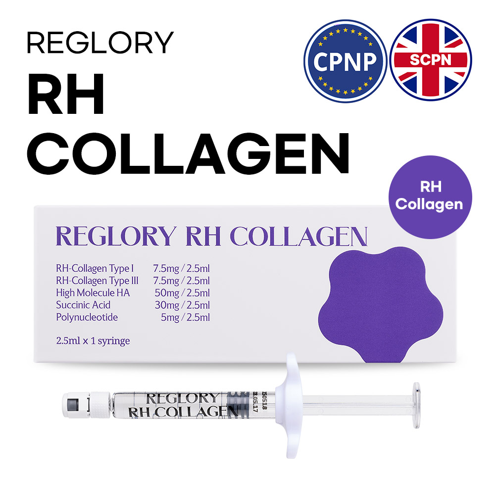REGLORY RH COLLAGEN to wstrzykiwany rewitalizator skóry nowej generacji, opracowany w celu radykalnej odbudowy, odmłodzenia i regeneracji starzejącej się skóry. Opracowany z wykorzystaniem najnowocześniejszej biotechnologii rekombinacyjnej, charakteryzuje się silną synergią identycznego z ludzkim kolagenu RH typu I i III, kwasu hialuronowego o dużej masie cząsteczkowej, kwasu bursztynowego i polinukleotydów w roztworze 2,5 ml.